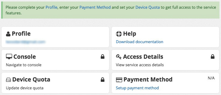 When you first log into the ACS, you'll be presented with the following window, which is the starting page until your subscription is activated with a valid payment method and device quota greater than zero.