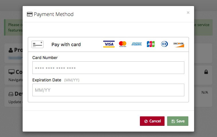 Click Payment Method to enter a credit card number and expiration date, and please make sure the billing details on the Profile page match those for the card on file.